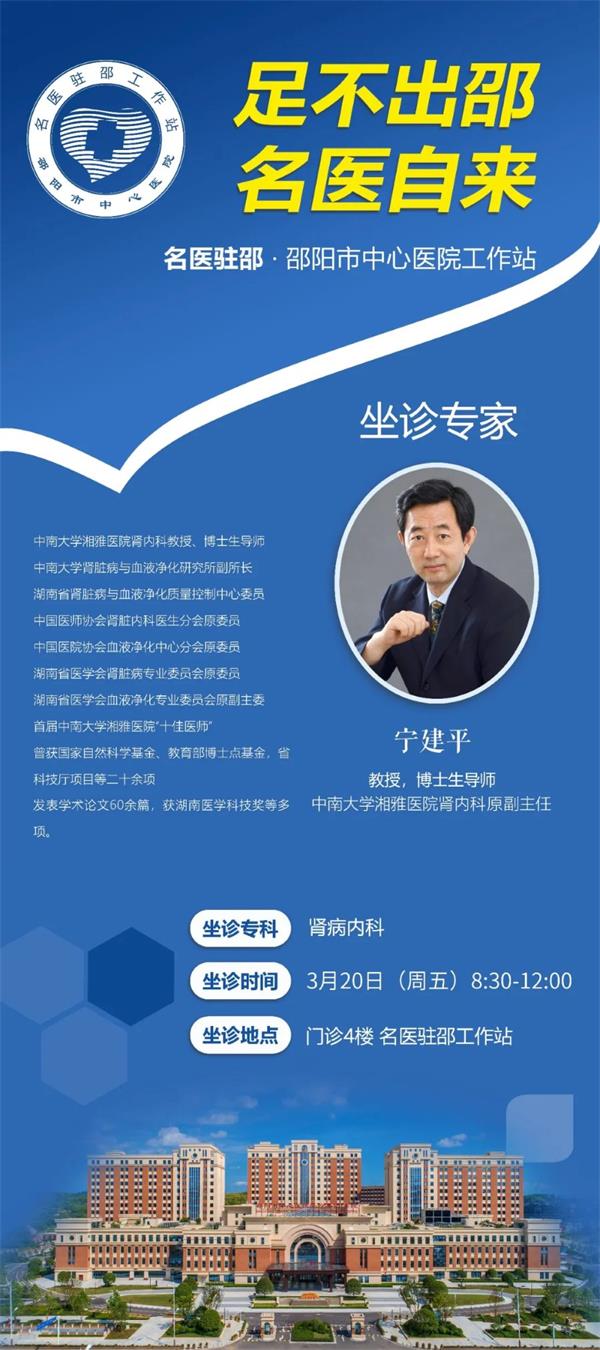 为响应国家“实施健康优先发展战略”,推动优质医疗资源下沉,3月20日,邵阳市中心医院名医驻邵工作站迎来重大利好——中南大学湘雅医院肾病大咖宁建平教授来邵阳开诊,让邵阳民众在家门口就能享受顶级医疗服务。