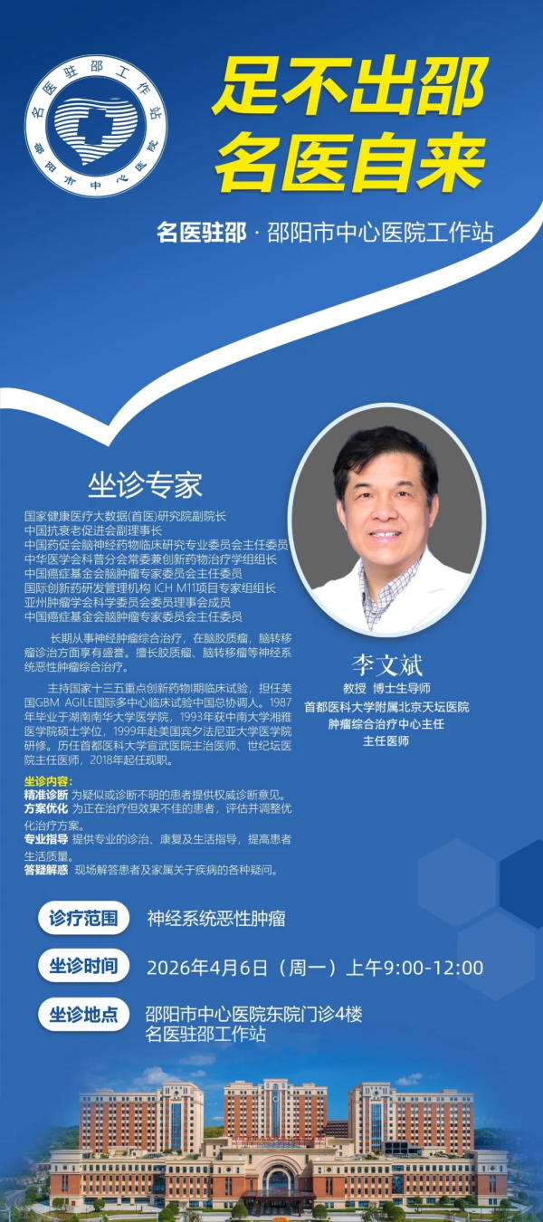 为响应国家健康优先发展战略,推动优质医疗资源下沉,让基层民众足不出邵就能享受顶级专家诊疗服务,邵阳市中心医院名医驻邵工作站特邀请首都医科大学附属北京天坛医院神经肿瘤大咖李文斌教授,于4月6日来邵开诊,实现优质诊疗“零距离”。